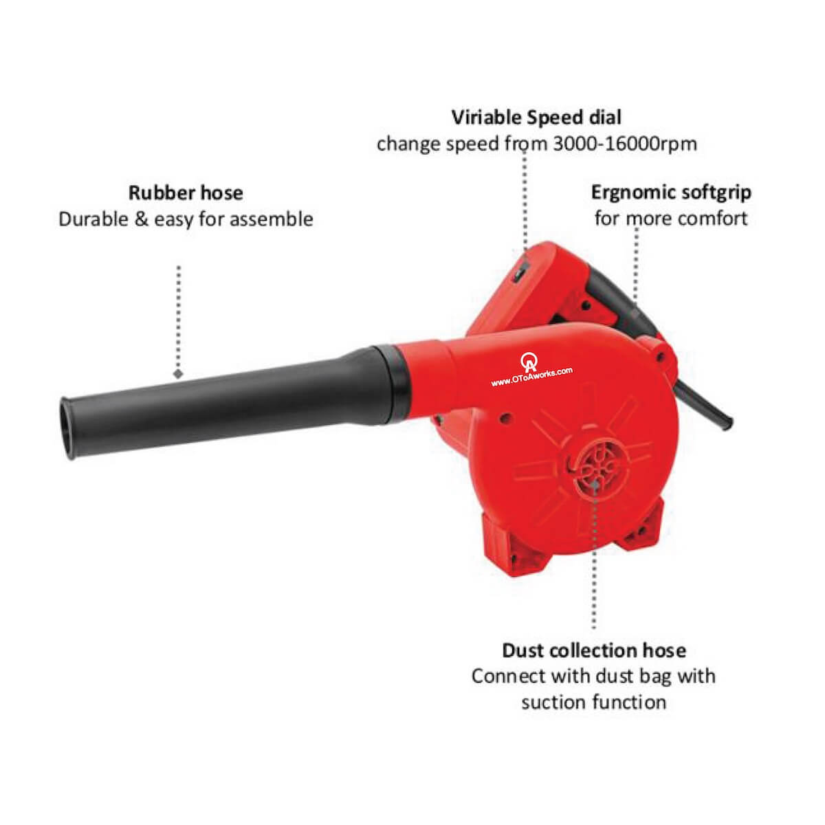 The OToAworks ABX8 Air Blower delivers powerful, versatile performance for cleaning, dust removal, and workshop maintenance. With its robust 600W motor and variable speed control ranging from 3000 to 12,000 RPM, you can easily adjust airflow to suit different tasks from gentle dusting to high-powered debris clearing. Its ergonomic soft grip handle ensures comfortable handling, while the lightweight design makes extended use fatigue-free.